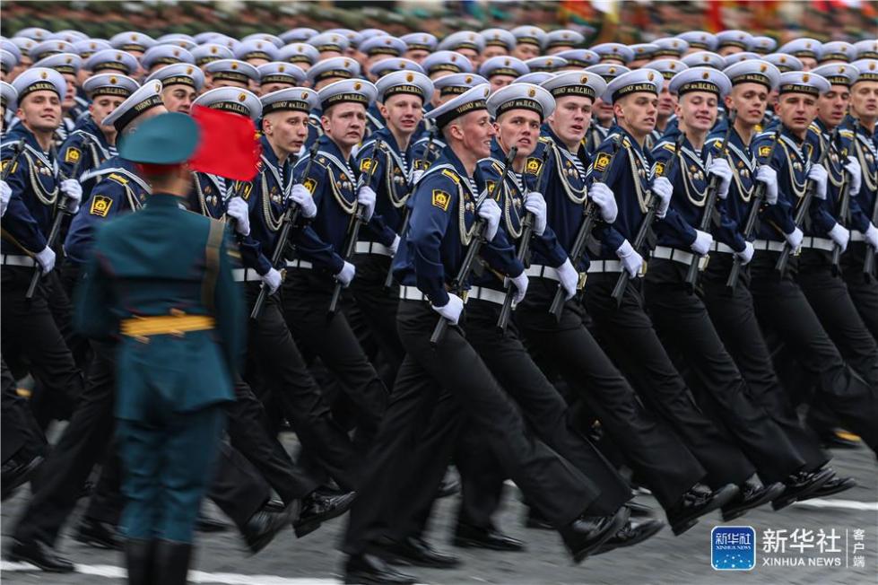 ↑5月9日,在俄罗斯莫斯科举行的胜利日阅兵式上,士兵列队走过红场。新华社发(叶甫盖尼·西尼岑摄)