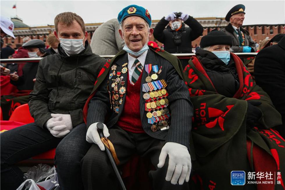 ↑5月9日,在俄罗斯莫斯科,二战老兵观看胜利日阅兵式。新华社发(叶甫盖尼·西尼岑摄)