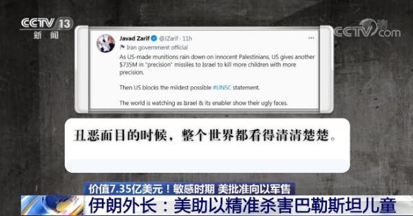 伊朗外长扎里夫17日在社交媒体上发文称,“就在美制弹药轰炸无辜巴勒斯坦人的时候,美国又给以色列提供了价值7.35亿美元的精确制导武器,让以色列更精准地杀害更多儿童。美国还阻挠安理会发布声明。”扎里夫将美国称为以色列的帮凶,认为整个世界都看清楚了他们的面目。
