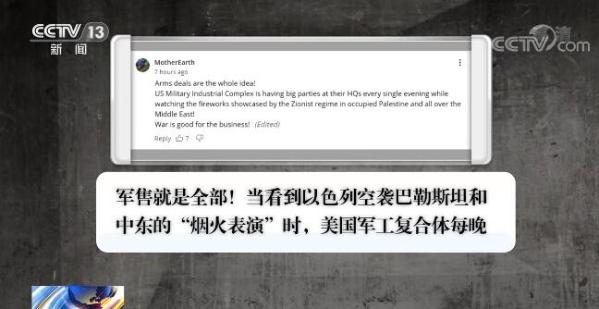 更有网友一针见血地指出,“军售就是全部!当看到以色列空袭巴勒斯坦和中东的‘烟火表演’时,美国军工复合体每晚都在总部开派对。战争对他们的生意有好处!”“美国这个国家不具备在和平时期发展经济的能力。国与国之间和平共处不符合他们的地缘政治利益。”