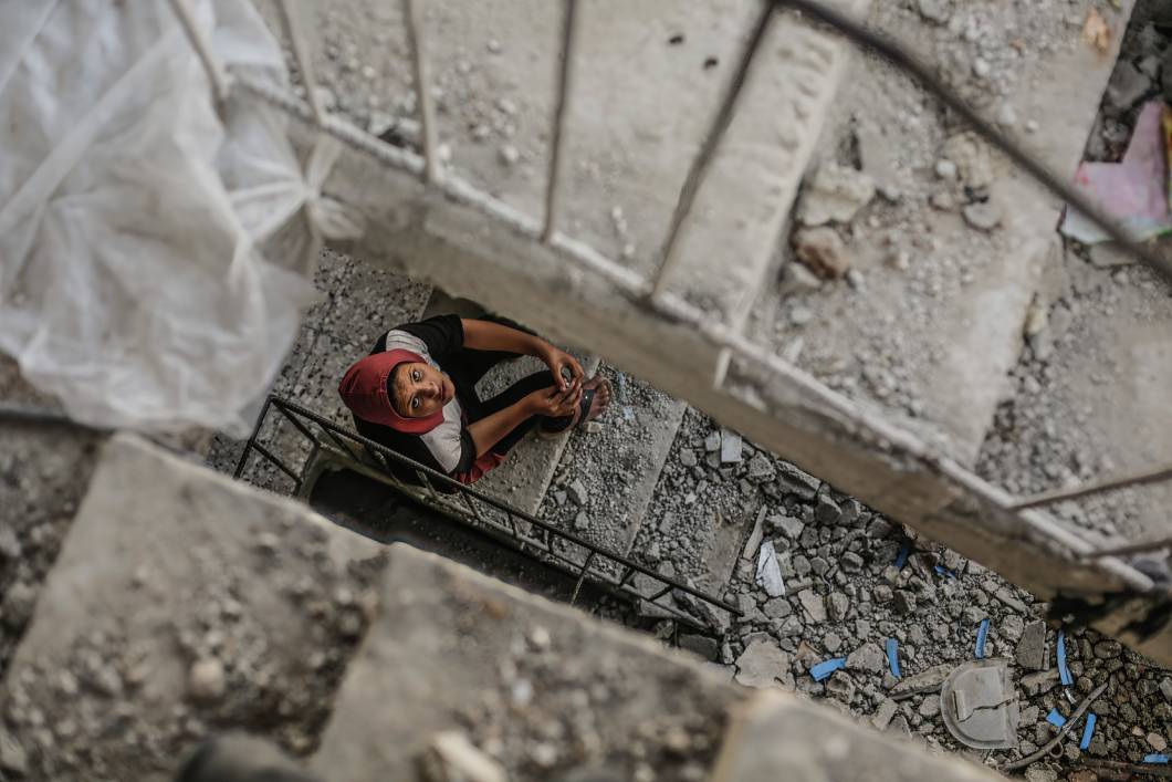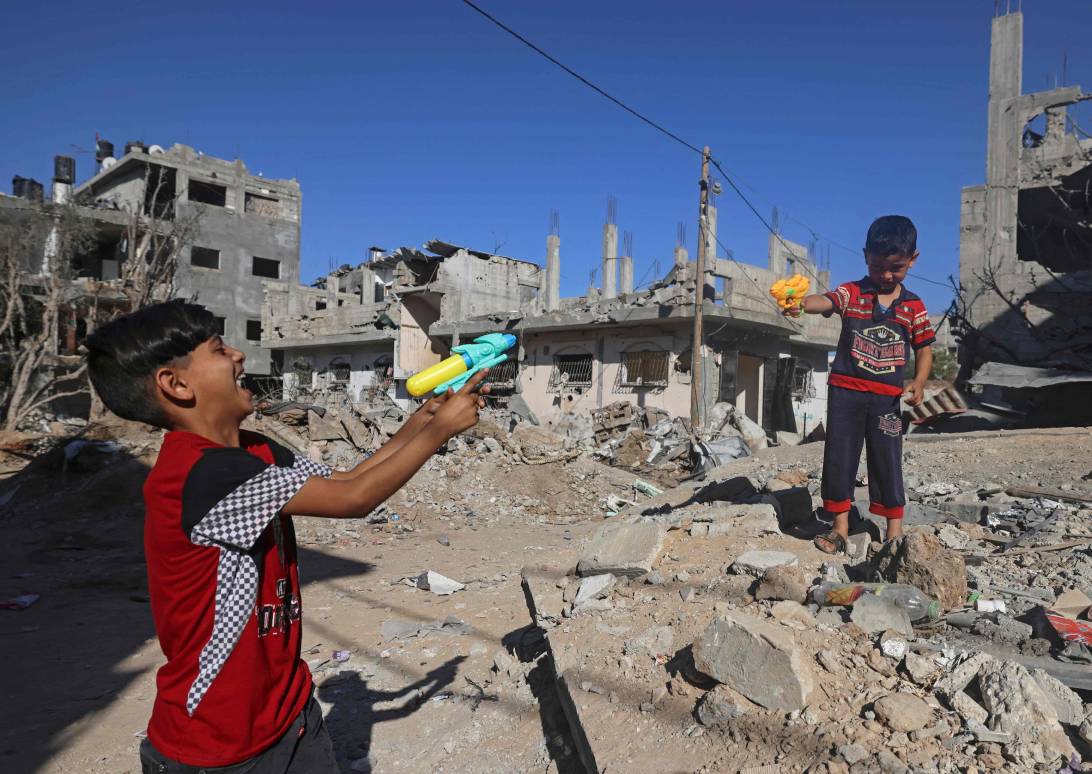 5月23日,加沙地带,巴勒斯坦儿童在废墟中玩水枪。图片来源 视觉中国