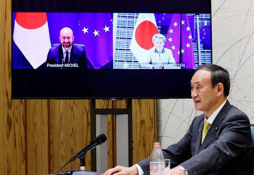 5月27日,欧盟与日本以视频形式举行峰会。日本首相菅义伟不忘“捎带”上中国,在发言中再次强调了“台湾海峡和平与稳定的重要性”。 视觉中国供图
