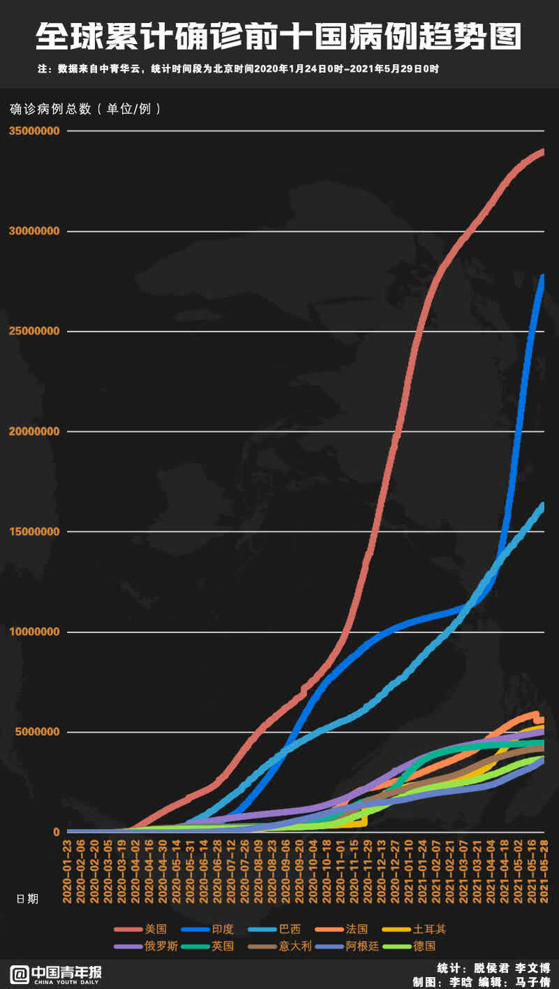 另据约翰斯·霍普金斯大学发布的疫情统计数据,截至北京时间5月30日9时,一周新增确诊病例数居前5位的国家依次为印度、巴西、阿根廷、哥伦比亚和美国;一周新增死亡病例数居前5位的国家依次为印度、巴西、美国、哥伦比亚和阿根廷。