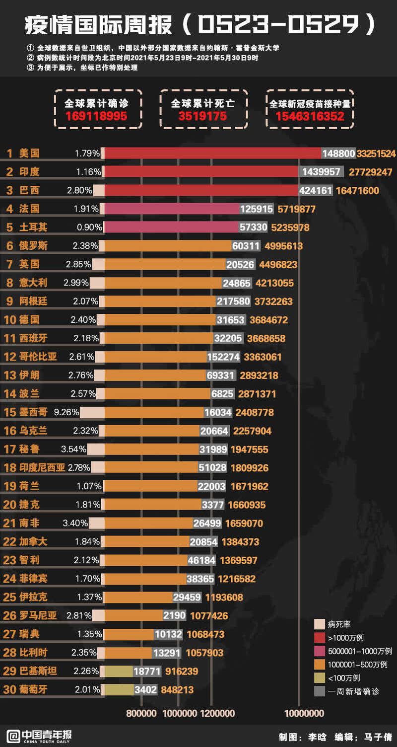 据世卫组织统计,截至北京时间5月30日9时,全球累计新冠确诊病例已超过1.69亿,累计死亡逾351万例;全球累计接种新冠疫苗超过15.4亿剂次。在5月29日前的一周里,全球新增确诊超过334万例,新增死亡约8.1万例,两项数据均为连续第4周下降。