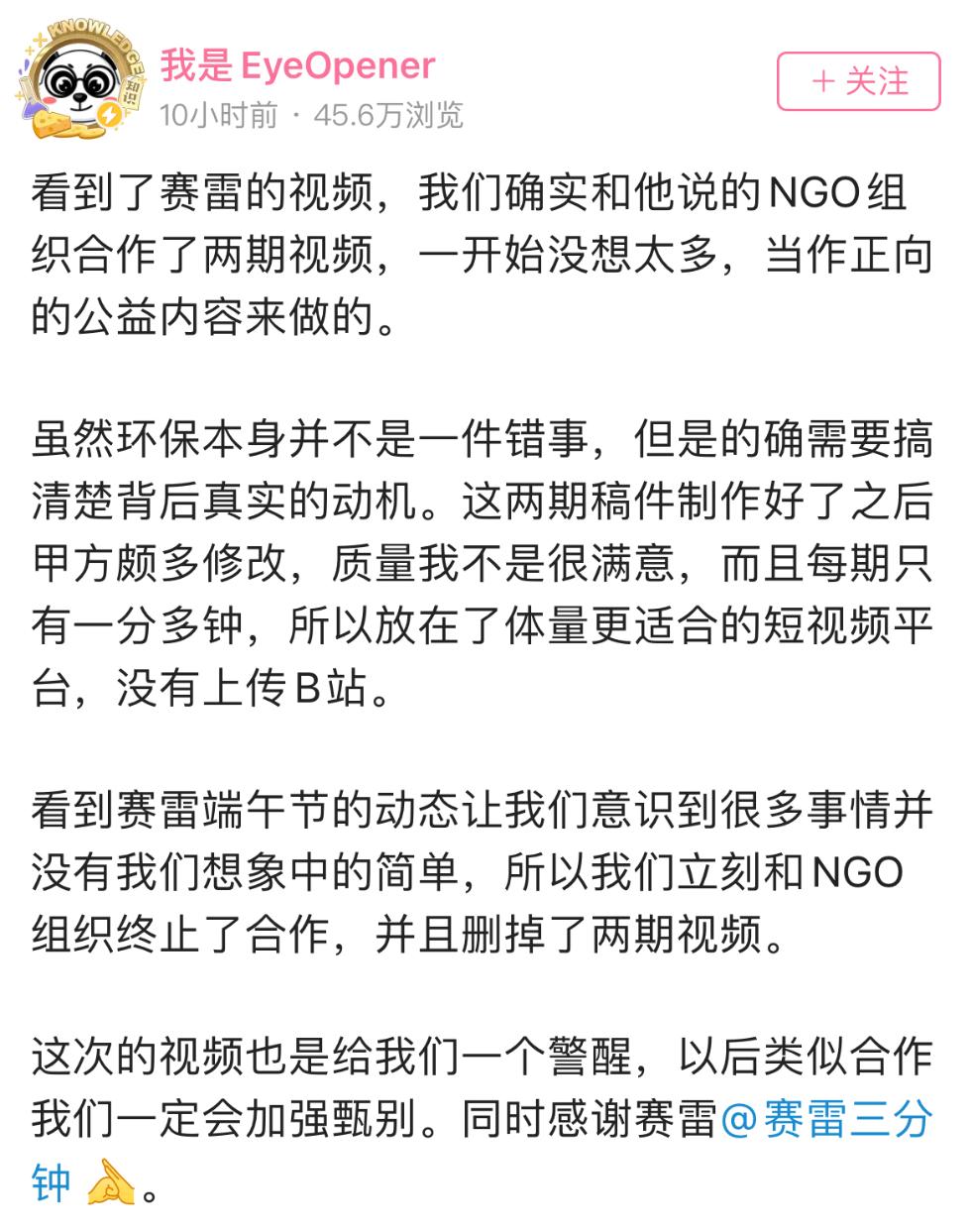被点名后,@EyeOpener 19日凌晨发声道歉,承认自己发布的相关视频的确是与@赛雷话金 爆出的“中外对话组织”合作产生,但事先并不知晓该组织背后的动机,已删除合作视频并终止后续合作。