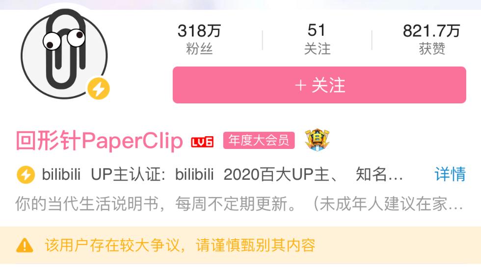 目前,@回形针PaperClip 的B站账户被标注了“该用户存在较大争议,请谨慎甄别其内容”。
