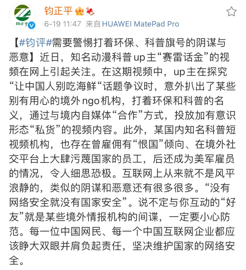 今天中午钧正平工作室·解放军新闻传播中心融媒体@钧正平 发表短评,提醒网友警惕打着环保、科普旗号的阴谋与恶意。“互联网上从来就不是风平浪静的,类似的阴谋和恶意还有很多很多。‘没有网络安全就没有国家安全’。说不定与你互动的‘好友’就是某些境外情报机构的间谍,一定要小心防范。每一位中国网民、每一个中国互联网企业都应该睁大双眼并肩负起责任,坚决维护国家的网络安全。”