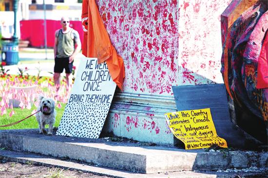 在曼尼托巴省省会温尼伯,抗议者推翻了立法机构前矗立的维多利亚女王雕像,同时被推倒的还有不远处的伊丽莎白女王雕像。人们在雕像和底座上按下象征原住民的红色手印,并留下标语:“我们都曾是孩子,带那些孩子回家”。