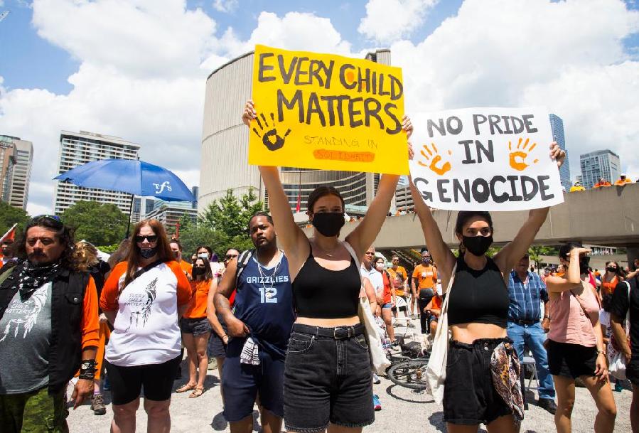△7月1日,人们在加拿大多伦多集会悼念原住民寄宿学校死难者。