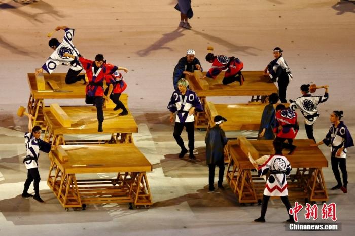 7月23日,第32届夏季奥林匹克运动会开幕式在日本东京新国立竞技场举行。图为开幕式现场表演。中新社记者 富田 摄