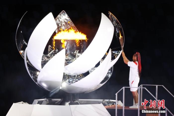 7月23日,第32届夏季奥林匹克运动会开幕式在日本东京新国立竞技场举行。图为日本网球运动员大坂直美点燃主火炬。中新社记者 韩海丹 摄