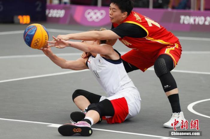 当地时间7月24日,中国选手张芷婷(右)在比赛中拼抢。当日,东京奥运会女子三人篮球比赛在东京青海城市运动公园举行。在一场小组循环赛中,中国队9:19不敌俄罗斯奥运队。中新社记者 富田 摄