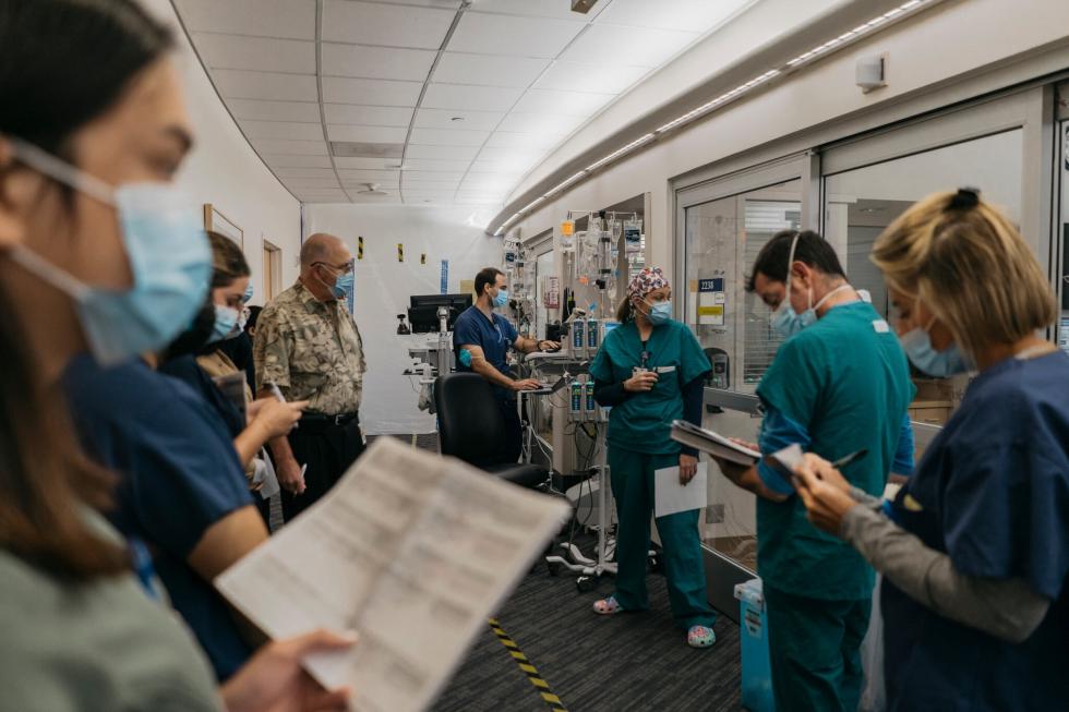 美国加州一医院中,医护人员在重症监护室忙碌。图源:纽约时报。