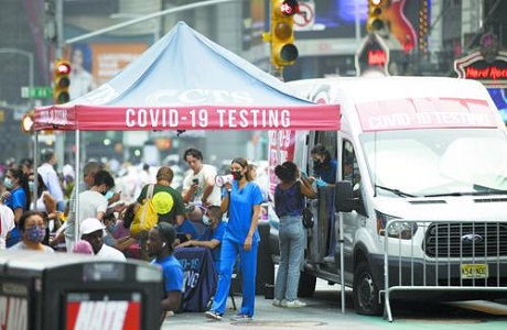 近期,美国新增新冠确诊病例、死亡病例、住院病例数等疫情核心指标严重反弹。图为 7月20日,人们在纽约时报广场的一个移动新冠检测点接受检测。新华社记者 王迎/摄