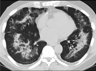 6天后的轴向CT平扫图像显示毛玻璃影变为实变和轻度结构扭曲。(同一病人CT影像)