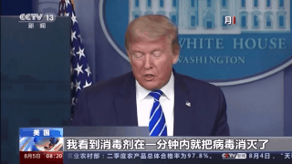 时任美国总统 特朗普: 我看到消毒剂在一分钟内就把病毒消灭了,有没有一种方法能达到这种效果呢,比如通过体内注射,或者类似清洗的方式。