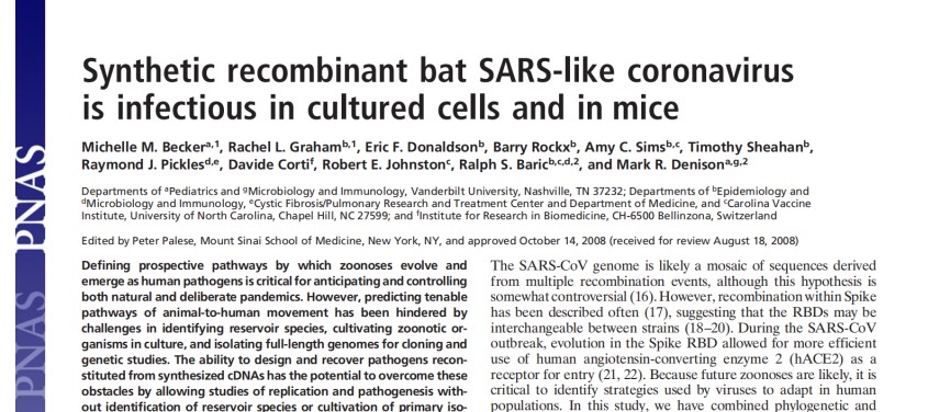 2008年11月,开头提到的论文《合成重组的蝙蝠SARS样冠状病毒在培养的细胞和老鼠中具有感染性》在美国科学院院刊上发表,里面记录了整个全新冠状病毒从设计、创造到复活,从刺突蛋白的构建到感染试验,整个过程在实验室中复刻了全新冠状病毒的产生和感染过程,这一论文当时引发关注,不少媒体以“美国科学家实验室成功重建非典病毒”做了报道。