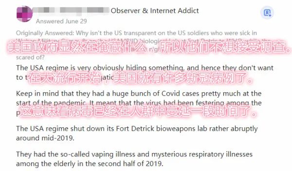 再看看美国在线交流平台,“为什么不调查德特里克堡?”“为什么美国天天叫喊要对新冠溯源问题透明,美国自己却不透明,在害怕什么?”等帖子连续几个月受到外国网友的广泛关注。