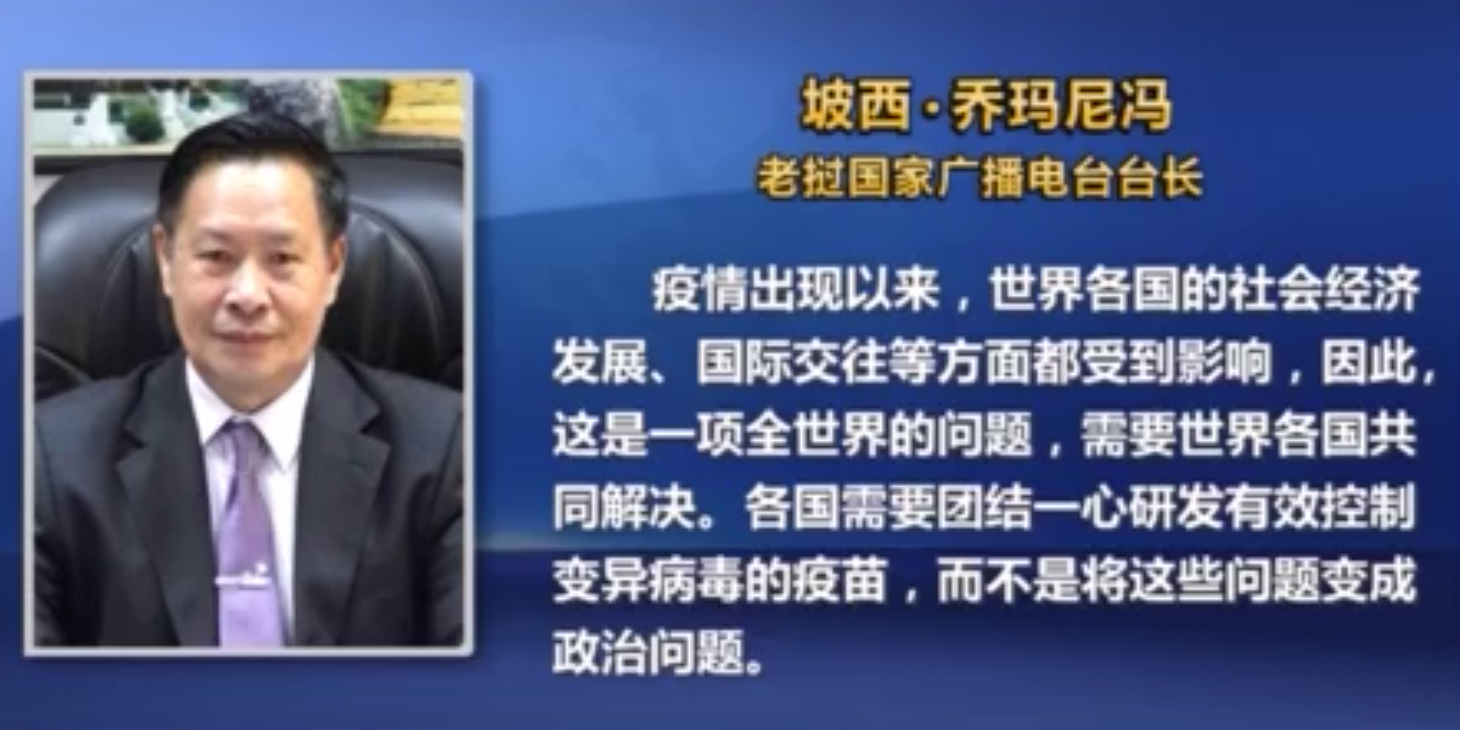 老挝国家广播电台台长 坡西·乔玛尼冯表示, 疫情出现以来,世界各国的社会经济发展、国际交往等方面都受到影响,因此,这是一项全世界的问题,需要世界各国共同解决。各国需要团结一心研发有效控制变异病毒的疫苗,而不是将这些问题变成政治问题。