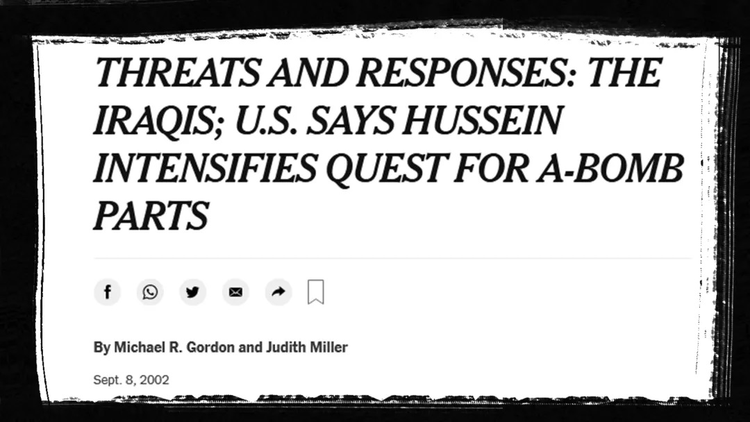 2002年9月7日,朱迪思·米勒援引不愿透露姓名的“美国官员”和“美国情报专家”的消息称,美国截获了伊拉克用来制造核武器的金属管。她还声称,美国政府官员注意到,伊拉克近几个月“正在全球范围内采购核原料来制造原子弹”。