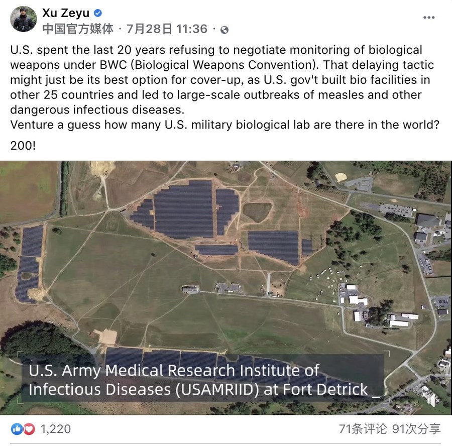 帖文写道:近20年来,美国一直拒绝重启《禁止生物武器公约》核查议定书的谈判。这一做法或许正是美国掩盖其秘密的最佳选择。美国在25个国家或地区建造生物实验室,并引发麻疹或其他危险传染疾病的大规模爆发。猜猜美国在世界建造了多少个生化实验室?200个!