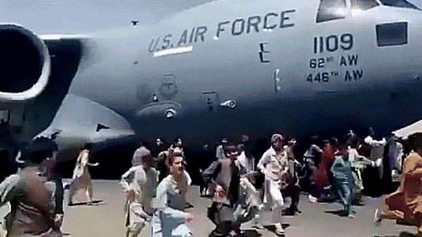 ▲ 2021年,“从实力地位出发”:在喀布尔卡尔扎伊国际机场,一名美军士兵咆哮着端起枪指向手无寸铁的阿富汗民众。