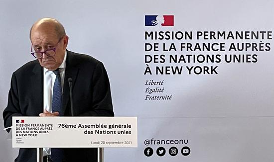 当地时间9月20日,法国外交部长勒德里昂在美国纽约举行的记者会上讲话。正在纽约联合国总部参加第76届联合国大会的勒德里昂,在讲话中指责美国“背叛”盟友、澳大利亚“在背后捅刀子”。新华社/路透