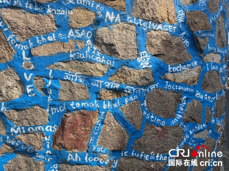 由朱福全设计的一面墙上写满“我爱你”81种语言,情定终身的人可以在这里签名。作品名为“姑苏不准分手墙”(摄影 黄蓉)