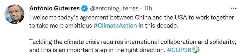古特雷斯在推特上写道:“欢迎中国和美国今天达成协议,将在这十年中共同采取更有雄心的气候行动。应对气候危机需要国际合作和团结,这(中美合作)是朝着正确方向迈出的重要一步。”