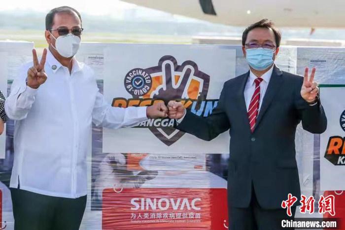 11月17日,菲律宾政府采购的中国科兴新冠疫苗运抵菲首都马尼拉,在马尼拉机场,中国驻菲律宾大使黄溪连(右)和菲政府应对新冠疫情总协调人卡利托·加尔韦斯在中国科兴新冠疫苗前合影。中新社发 中国驻菲律宾使馆 供图
