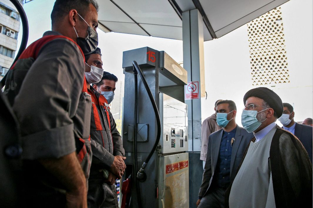 10月27日,伊朗德黑兰,伊朗总统易卜拉欣·莱希(右)到访当地一家加油站。26日,伊朗全国燃油配给系统遭到网络攻击,多地加油站陷入瘫痪。图片来源 视觉中国