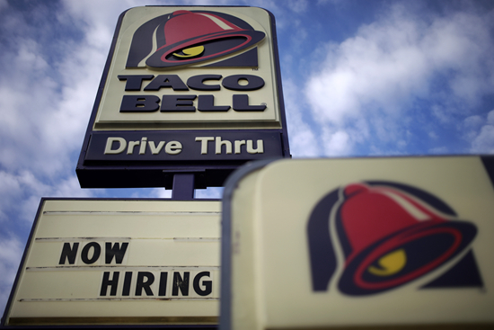 当地时间12月6日,美国印第安纳州一家“塔可贝尔”连锁快餐店外挂着“招聘”的标牌。美国劳工部调查结果显示,美国空缺岗位数量持续上升,10月职位空缺从9月的1060万个升至1100万个,企业持续面临“招工难”。视觉中国供图