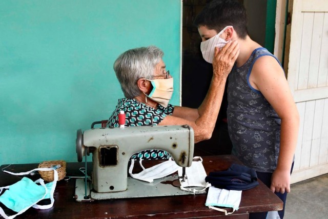 2020年5月27日,在古巴首都哈瓦那郊外,87岁的古巴老人伊赖达·埃尔南德斯在家中为孙子戴上她自己制作的口罩。新华社发(华金·埃尔南德斯摄)