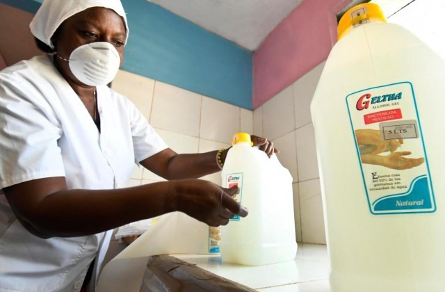 2020年3月26日,在古巴哈瓦那酿酒厂,一名工人给装有抗菌洗手凝胶的瓶子贴标签。新华社发(华金·埃尔南德斯摄)
