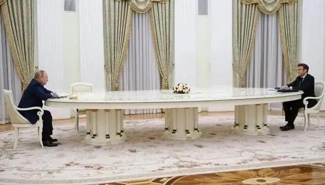 ▲普京与马克龙隔着4米多的长桌举行会晤