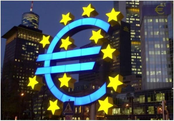 ▲欧洲中央银行大楼前的巨型钢铸欧元雕塑
