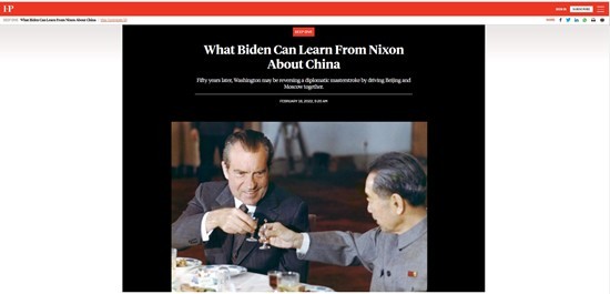 2月18日,美国《外交政策》杂志网站刊发迈克尔·赫什的文章,题为:“关于中国,拜登能向尼克松学习什么”。(截图自《外交政策》杂志网站)