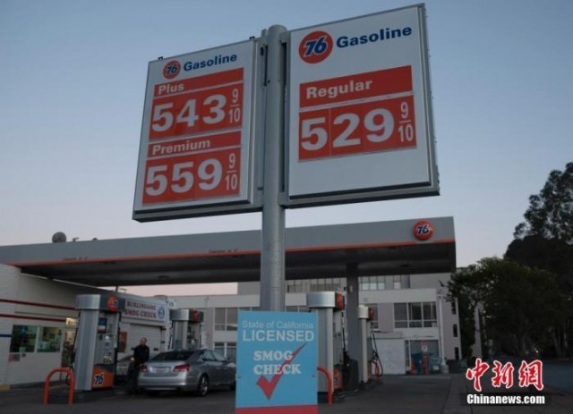 当地时间3月6日,一位车主在美国加州圣马特奥县为车辆加油。中新社记者 刘关关 摄