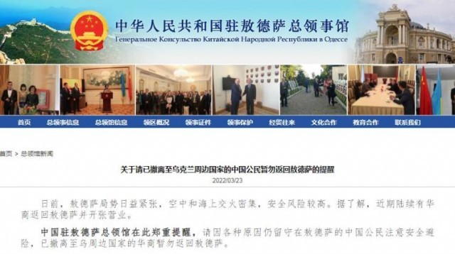 中国驻敖德萨总领馆在此郑重提醒,请因各种原因仍留守在敖德萨的中国公民注意安全避险,已撤离至乌周边国家的华商暂勿返回敖德萨。