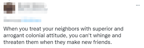 有人说,“当你以优越和傲慢的殖民态度对待邻居时,你不能在他们结交新朋友时抱怨和威胁他们。”“澳大利亚没有与我们的太平洋邻国认真接触。作为一个机会主义者,我们只能为我们短视的世界观负责。”