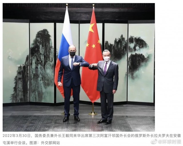 3月30日,中国国务委员兼外长王毅同来华出席第三次阿富汗邻国外长会的俄罗斯外长拉夫罗夫在安徽屯溪举行会谈。这是今年2月俄乌冲突爆发以来拉夫罗夫首次访华,也是冲突爆发后中俄两国外长首次面对面会谈。