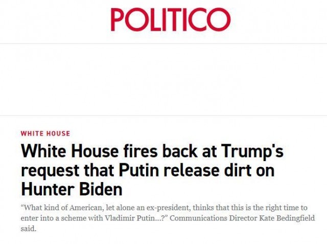 【环球网报道】据美国“政治”新闻网、路透社报道,对于美国前总统特朗普公开呼吁俄总统普京爆拜登儿子“黑料”一事,白宫当地时间周三(30日)作出回应,称在俄乌冲突之际,发表这些言论的时机非常糟糕,并抨击“只有一个人(能做出这样的事)”,那就是特朗普。