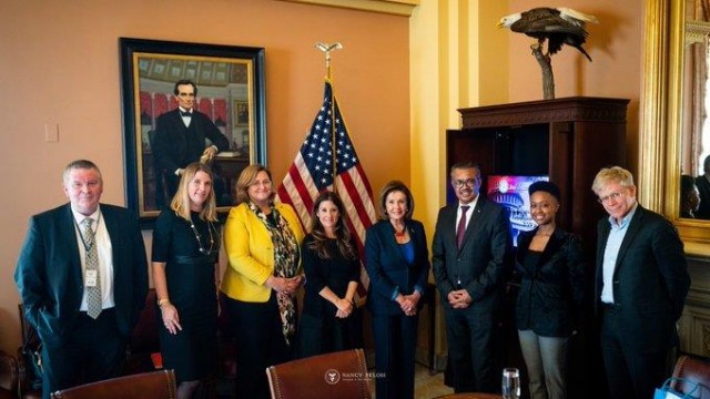 当地时间5日上午,佩洛西在议长办公室会见前来拜访的世界卫生组织总干事谭德塞。