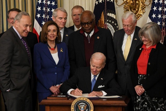 当地时间6日,拜登签署《邮政服务改革法案》。佩洛西出席仪式,一同出席的还有美国土安全与政府事务委员会主席加里·彼得斯、多位美国国会议员和美国邮政工人工会成员。