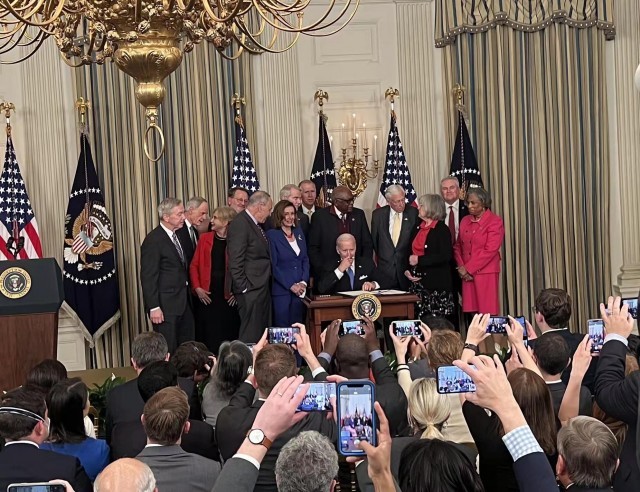 参加5日晚同一场签署仪式的还有美国前总统奥巴马、副总统哈里斯、美国卫生与公众服务部部长贝塞拉以及多位国会议员。