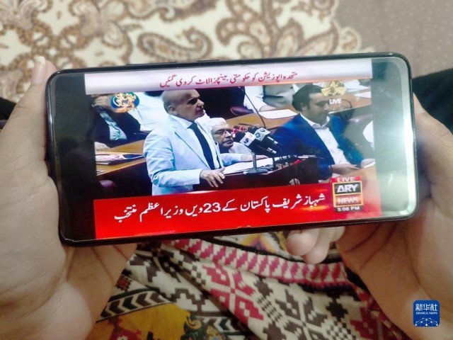这是4月11日在巴基斯坦首都伊斯兰堡拍摄的夏巴兹·谢里夫当选巴基斯坦新任总理新闻画面。新华社发(艾哈迈德·卡迈勒 摄)