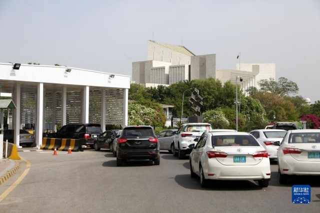 4月11日,载有国民议会议员的车辆抵达巴基斯坦首都伊斯兰堡的国民议会大楼。新华社发(艾哈迈德·卡迈勒 摄)