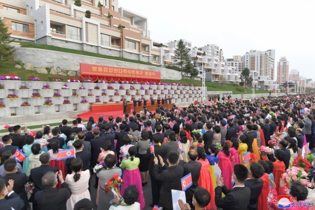 【环球网报道】据朝中社14日报道,朝鲜普通江岸梯田式住宅区竣工典礼于4月13日举行,朝鲜劳动党总书记、朝鲜民主主义人民共和国国务委员长金正恩同志出席竣工典礼,并为竣工剪彩。