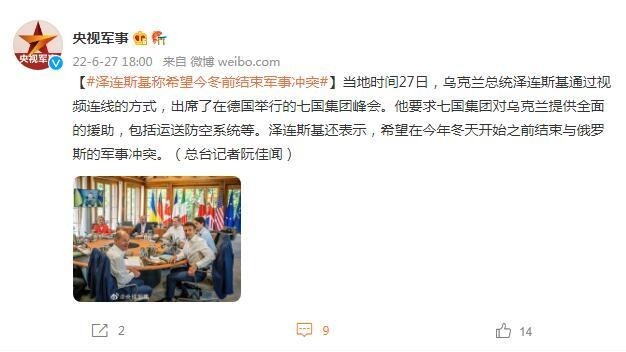 当地时间27日,乌克兰总统泽连斯基通过视频连线的方式,出席了在德国举行的七国集团峰会。他要求七国集团对乌克兰提供全面的援助,包括运送防空系统等。泽连斯基还表示,希望在今年冬天开始之前结束与俄罗斯的军事冲突。(总台记者阮佳闻)