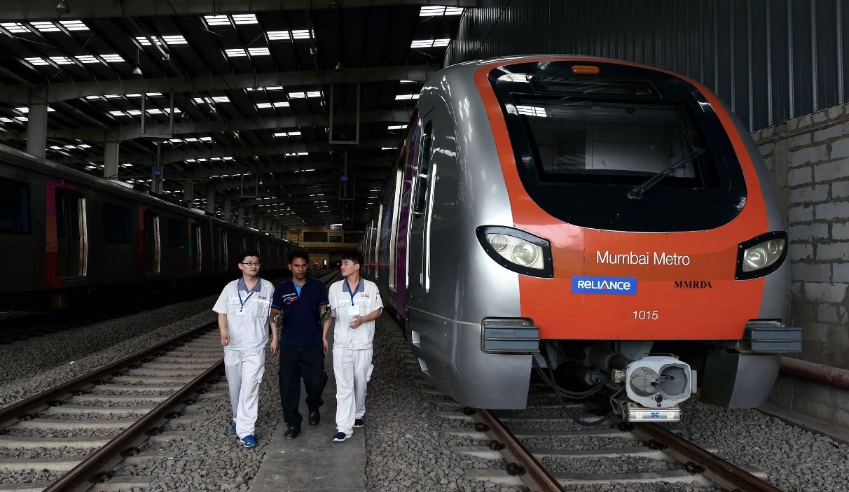 2018年6月27日,孟买,中印双方工作人员在孟买地铁一号线车辆段工作。该线路车辆由中车南京浦镇车辆有限公司制造。